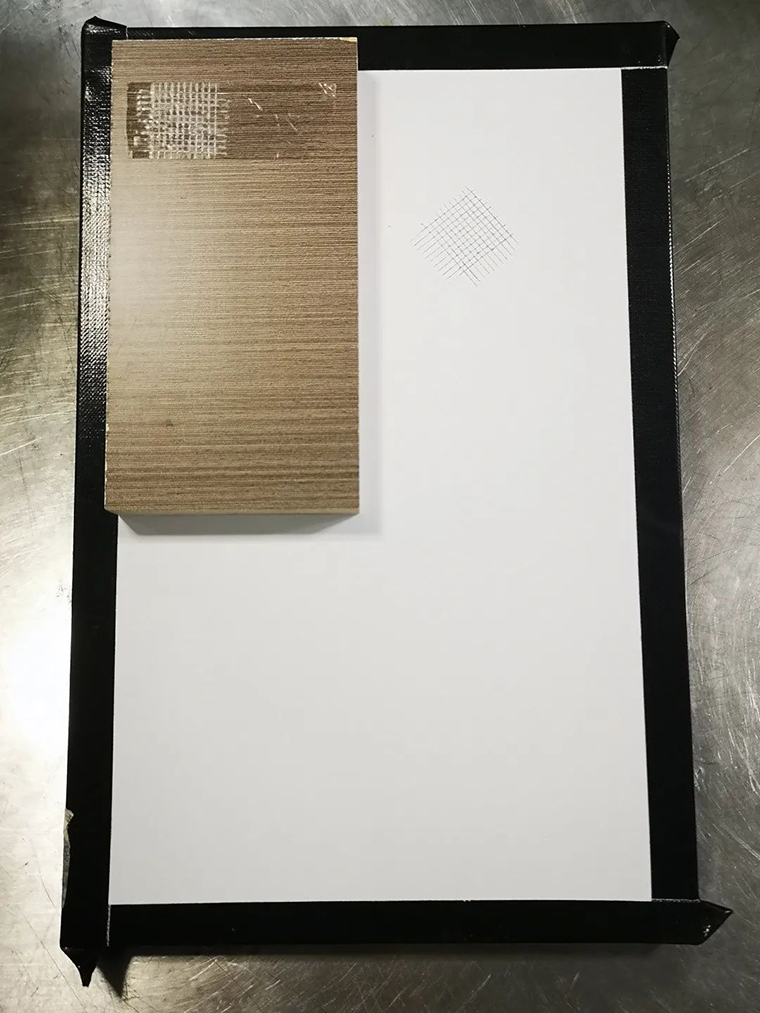 樣板10cm *15cm噴涂兩道110g/㎡,漆膜完全干燥后堆迭,放一個重壓槌(≒706g)在50℃下烘烤4hrs,取出冷卻分離,不可傷及漆膜。