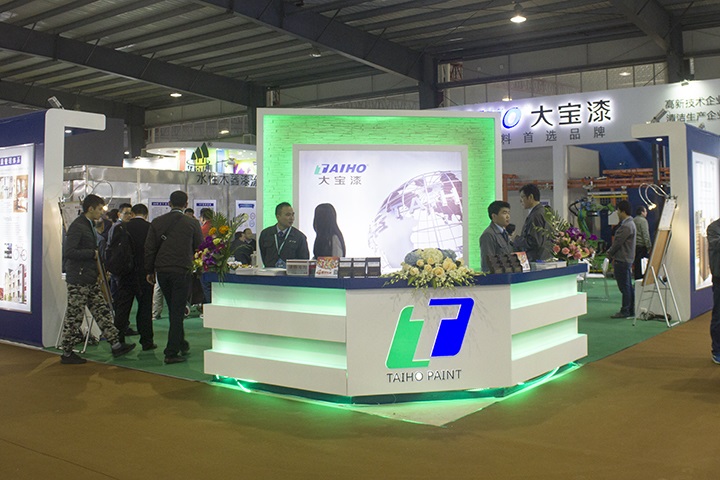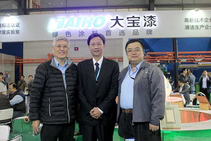 大寶國際董事長陳賀生先生(中間)與大寶化工總經(jīng)理陳春華先生、大寶化工工程部劉昌屏經(jīng)理(右一)于大寶漆展位合影