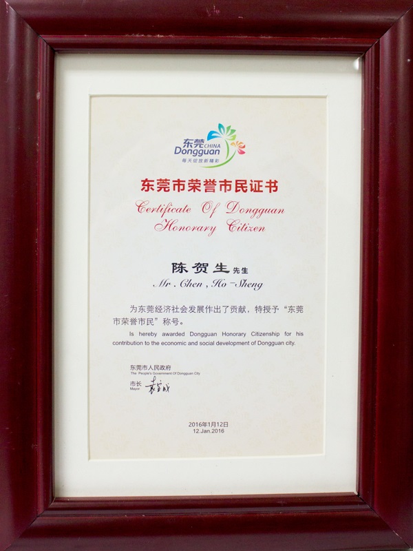 2016年1月12日,第五屆“東莞市榮譽(yù)市民”授榮儀式在會展國際大酒店隆重舉行,東莞大寶化工制品有限公司董事長陳賀生等45人獲“東莞市榮譽(yù)市民”稱號。