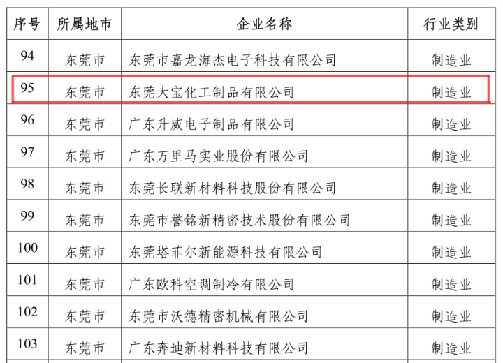 11月20日,第十八批廣東省省級企業技術中心名單于廣東省工業和信息化廳官網正式公布。其中,東莞大寶化工制品有限公司榜上有名。