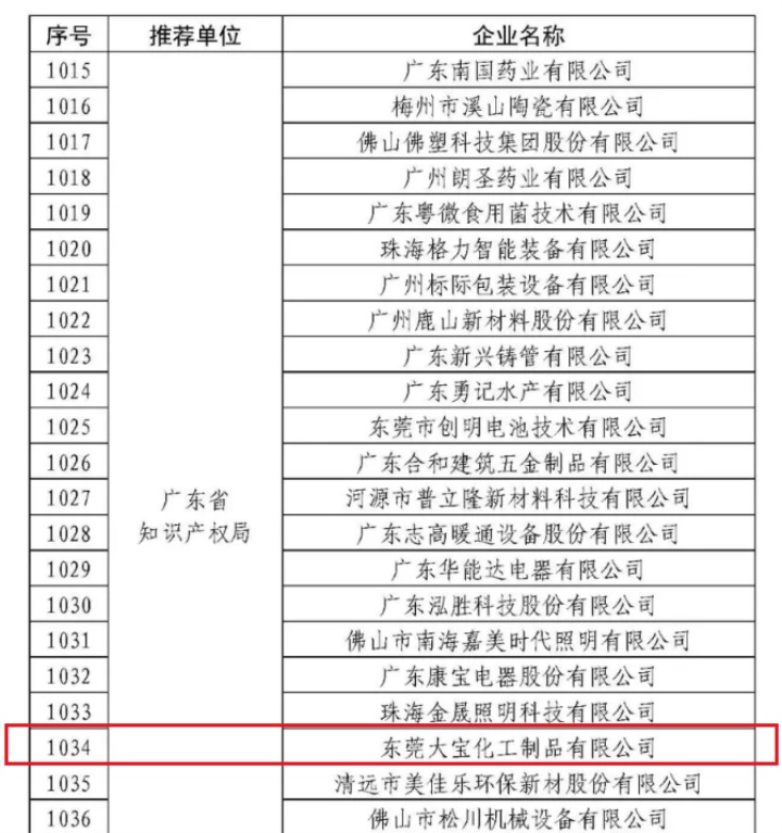 11月25日,國家知識產權局公示了2019年度國家知識產權優勢示范企業評審和復驗結果,東莞大寶化工獲評“國家知識產權優勢企業”,公司指標體系得分90分以上。