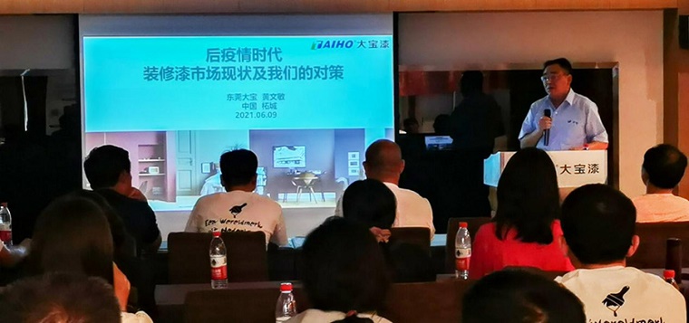隨后由業三部東北區域業務課長黃河玉向經銷商系統而專業地介紹了近期公司上市的各渠道新產品。從零售渠道新推出的大寶抗病毒全效墻面漆零純+植物抗菌墻面漆,到專業領域的絲絨蛋殼光產品、陽臺廚衛專用漆、工業風裝修所需的炫黑涂料;從工程渠道的仿石漆產品、地坪漆到工程領域新關注的無機涂料產品系列、大健康產品系列再到工業領域的輕防腐系列產品;從家裝市場輔助材料的防水、墻地固、瓷磚背膠系列到工程翻新和維修渠道的滲透型界面劑、大寶液體卷材等,黃課長結合每種產品的上市背景、物性介紹、產品認證和檢驗報告等內容向經銷商推介每種產品的市場推廣方向、市場銷售機會及施工注意事項。