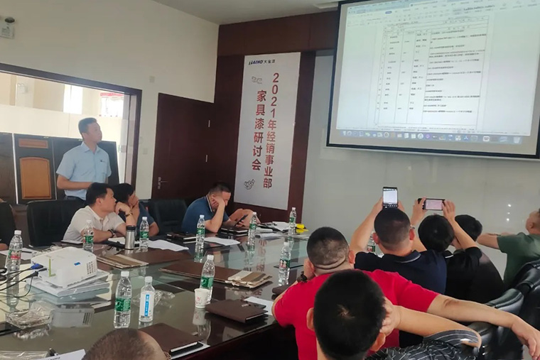 而后,經銷事業部家具漆執行經理劉國勇帶來了以“破局 共生”為主題的工作報告。劉執行經理首先對家具行業從國際環境到國內環境到市場環境現狀進行了深入的分析,從公司在國內市場布局、2021年上半年業績達成情況分析、客戶定位、產品品項突破、特色化產品、市場流通型產品、服務支持等方面進行了全面的講解,通過“破局 共生”兩部分希望公司與經銷商一起并肩作戰,共迎困難。