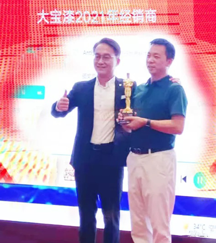 會議伊始,經銷事業部葉子琛副總經理為不忘初心、始終堅守,專心經營大寶漆的武漢寶塔商貿李軍總經理(以下簡稱李總)頒發特別感恩獎,對20多年來用心經營大寶漆的李總所做的貢獻給予高度肯定和感謝。