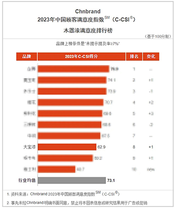大寶漆再度上榜“墻面漆滿意度排行榜”及“木器漆滿意度排行榜”雙榜單,其中墻面漆較去年排名上升2位,木器漆較去年排名上升1位。