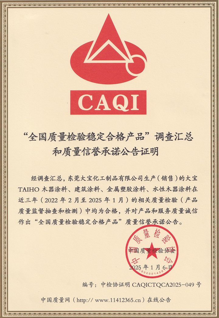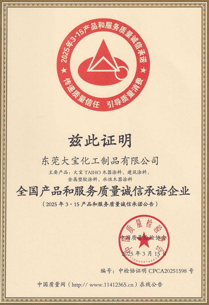 值此國際消費者權(quán)益日之際(2025年3月15日),中國質(zhì)量檢驗協(xié)會隆重舉辦"產(chǎn)品和服務(wù)質(zhì)量誠信承諾"主題活動。大寶漆憑借卓越的產(chǎn)品品質(zhì)與優(yōu)質(zhì)的服務(wù)體驗,在本次評選中一舉斬獲"全國產(chǎn)品和服務(wù)質(zhì)量誠信承諾企業(yè)"和"全國質(zhì)量檢驗穩(wěn)定合格產(chǎn)品"兩項殊榮。
