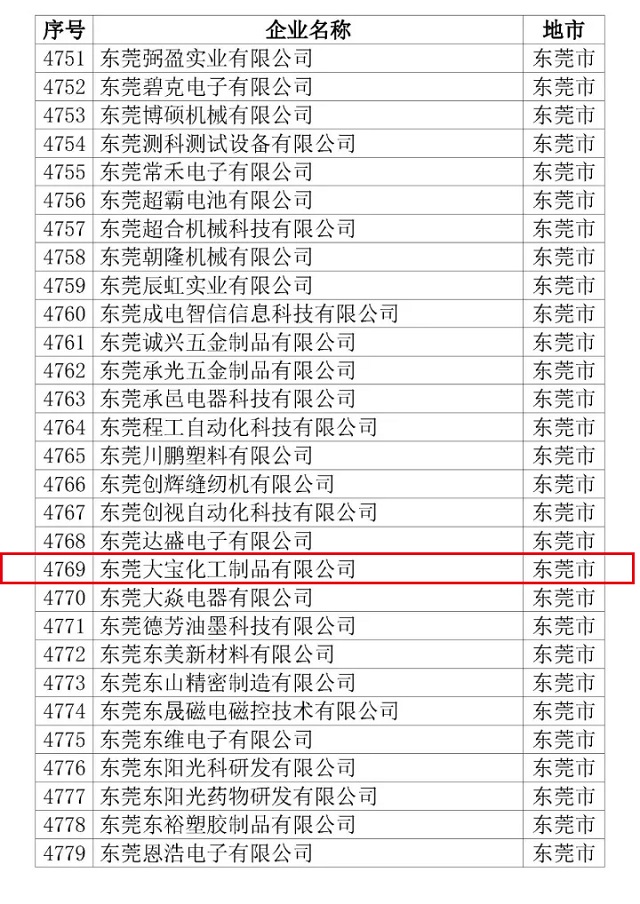 12月11日,公示的廣東省2017年第二批擬認(rèn)定國(guó)家高新技術(shù)企業(yè)名單,東莞大寶化工再次通過(guò)“高新技術(shù)企業(yè)”認(rèn)定,是繼2011年被認(rèn)定為高新技術(shù)企業(yè)后第三次通過(guò)認(rèn)定。它不僅標(biāo)志著大寶化工的研發(fā)創(chuàng)新工作邁上新的臺(tái)階,也表明大寶化工的自主研發(fā)能力和創(chuàng)新能力均在涂料行業(yè)中處于前列!