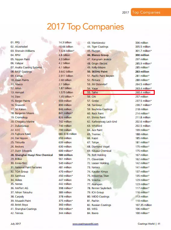 日前,美國Coatings World雜志(July 2017)最新發布2017年全球頂級涂料制造企業銷售額排行榜(前84名)(2017 Top Companies),中國5家涂料企業殺入重圍。大寶漆再次進入該榜單,位列第55名,較上年排名前進了三位。