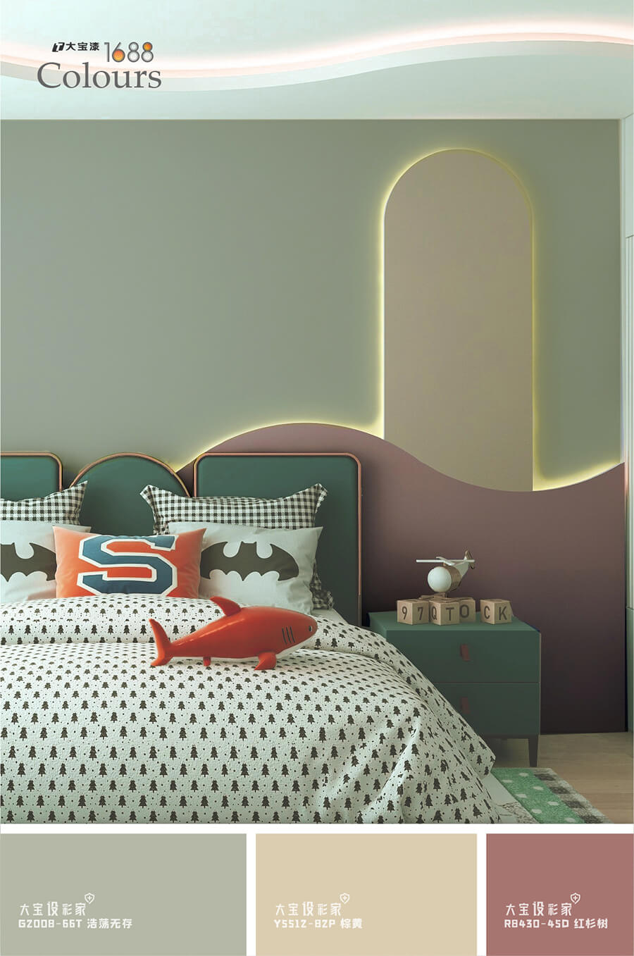 灰綠的莫蘭迪色在空間中百搭零失誤,運用在臥室空間會更舒服穩重,大寶荷采綠(G4940-30A)賞心悅目的顏色,富有治愈氣息,可以作為大量的墻面色彩使用,也可以用櫥柜、茶幾、床組等軟裝作為色彩載體進行局部性點綴,不僅可以點亮空間,還能帶來清爽自由。